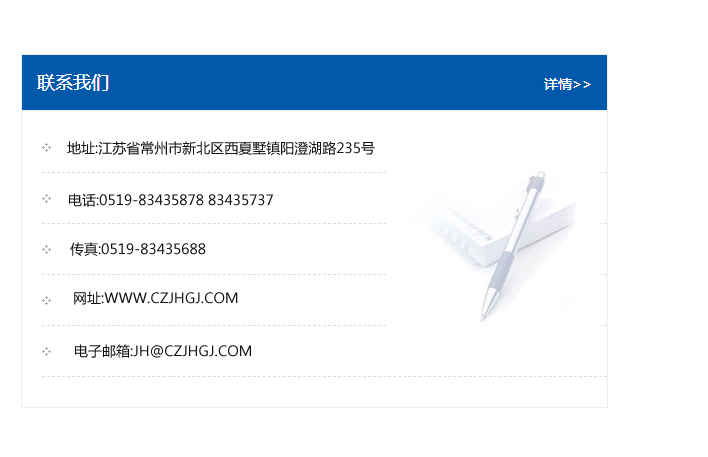 傳真:0519-83435688    郵編:213135    網(wǎng)址:WWW.czjhgj_com.lyasn.com    電子郵箱:JH@czjhgj_com.lyasn.com